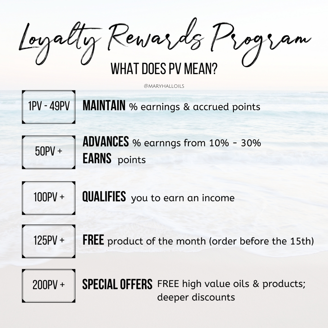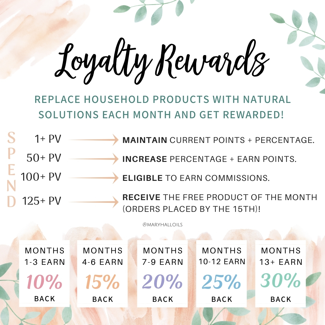 The Loyalty Rewards Program is the way to get the biggest bang for your buck! As a wholesale member, you are already saving 25% off retail, but with the Loyalty Rewards Program you earn points each month that allows you to get free doTERRA products.